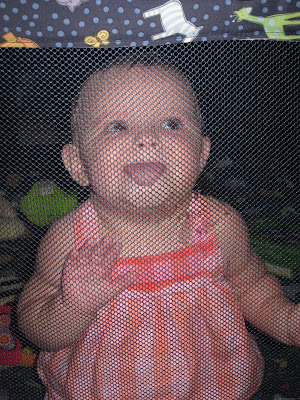 So, by the time I got back from the bachelor party in Las Vegas, Grace had learned to crawl. I spent the rest of Sunday trying to child proof the house. Out went the playmat and in went the play pen. (She looks like a little POW sitting inside of it.) She has managed to bump her head quite a few times, no matter what we do.
